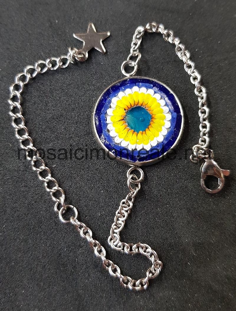 Galvanizzato e anallergico. All'interno: smalti filati di diverse dimensioni. Colori: blu, giallo, bianco, rosso, celeste