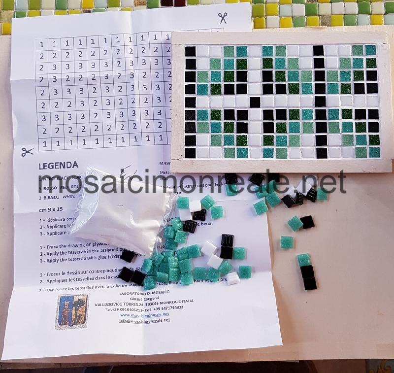 La scatola contiene: tessere in pasta di vetro, cemento bianco, istruzioni per realizzare il mosaico