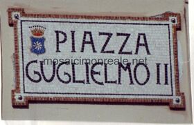 Targa rappresentante una piazza di Monreale, realizzata con tessere di marmo prelucidate, smalti, ori di Venezia e gres. Rifinita con colata di resina epossidica.