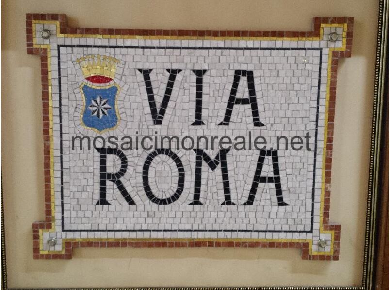 Targa rappresentante una via di Monreale realizzata con tessere di marmo prelucidate, smalti, ori di Venezia e gres. Rifinita con colata di resina epossidica.